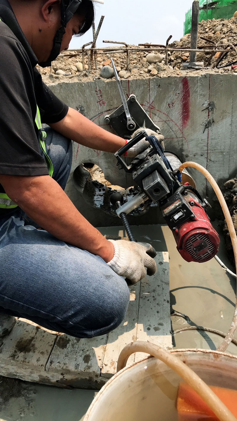 本公司備有直徑 500mm 鑽頭,曾完成 4m厚牆板鑽孔作業,詳細施工範圍限制可以和我們諮詢、溝通。